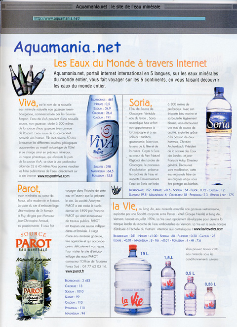 Accueil - Collection d'étiquettes - Les pays d'eau - Les villes d'eau - Les partenaires Club des aquamaniaques - Suggestions - Le Forum de l'eau - Téléchargement - Liens Légendes et histoires d'eaux - Reportages - La presse - Collection de timbres Législation - Environnement - Santé - Thermalisme - Thalasso - Science Salons - Dossiers thématiques - Informations - Bibliographie - Remerciements - Contacts Copyright2000-2011© aquamania.net® Reproduction totale ou partielle interdite